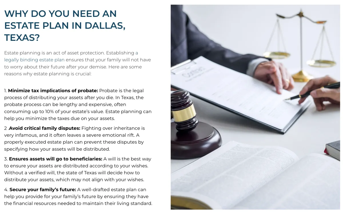 Our Dallas estate planning attorneys have over a decade of experience helping Texas residents establish an estate plan for themselves and their families. Call us at (214)777-3319 to schedule a consultation with one of our proficient lawyers